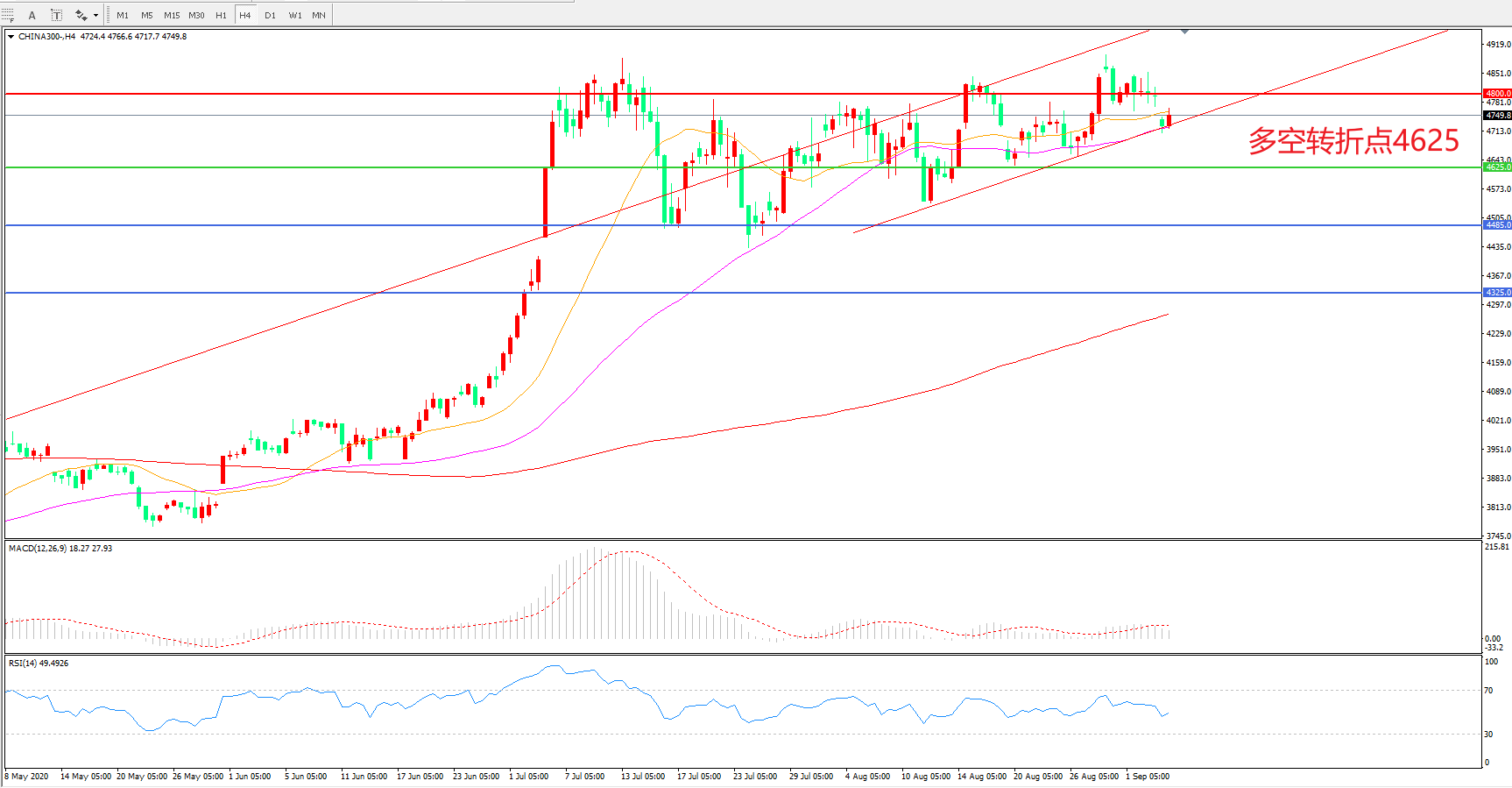 4小时图看,沪深300跳空低开后小幅回升,多空双方陷入对峙,55周期均线成为短期支撑, MACD红柱缩短,RSI指标走平,日内延续震荡概率较大。