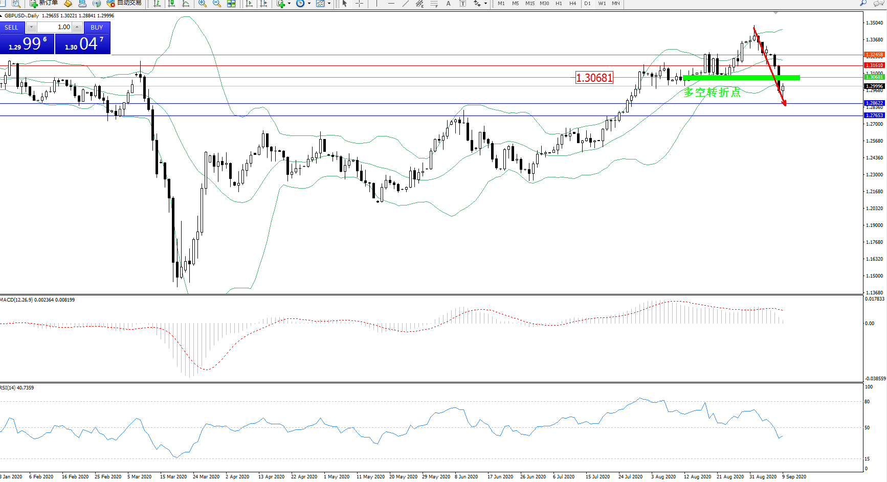 交易策略:1.30681下方看跌,目标1.28622、1.27653