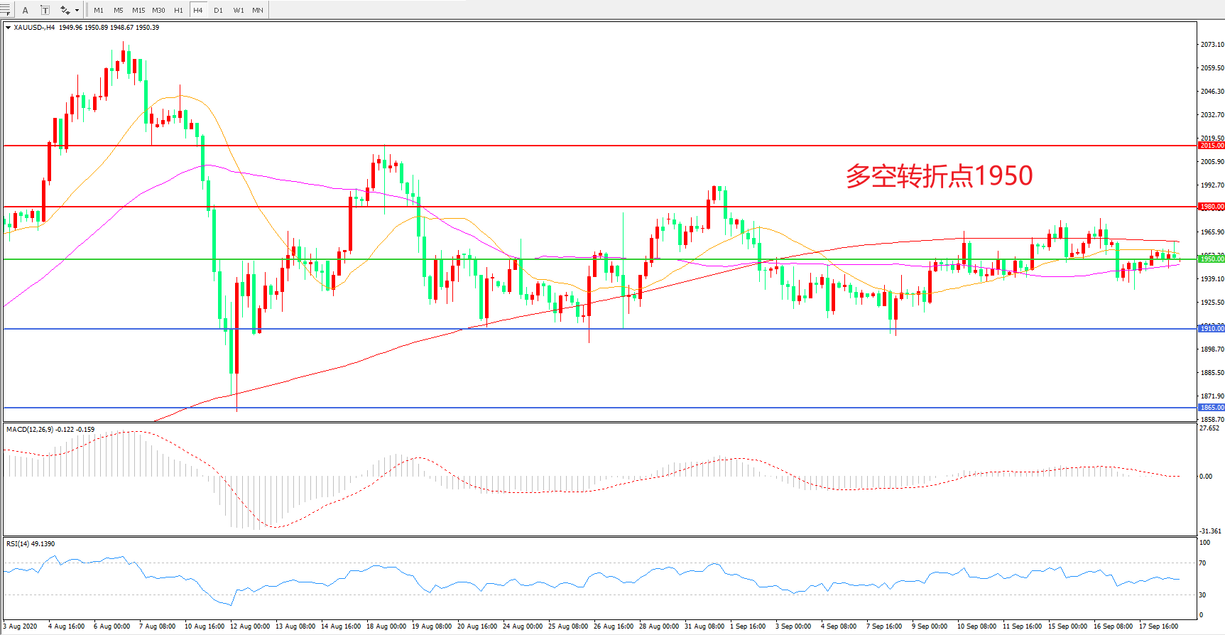 上周,全球三大央行同时选择“按兵不动”,维持当前利率不变,从目前看,宽松的货币政策是各国央行唯一也是必须的选择。各国央行的宽松措施形成了金价中期上涨的重要推动力但美元的强势依然限制着金价走高,现货黄金震荡整理后,收报1951.16美元/盎司,目前多空力量较为均衡,行情陷入收缩整理的走势中。
