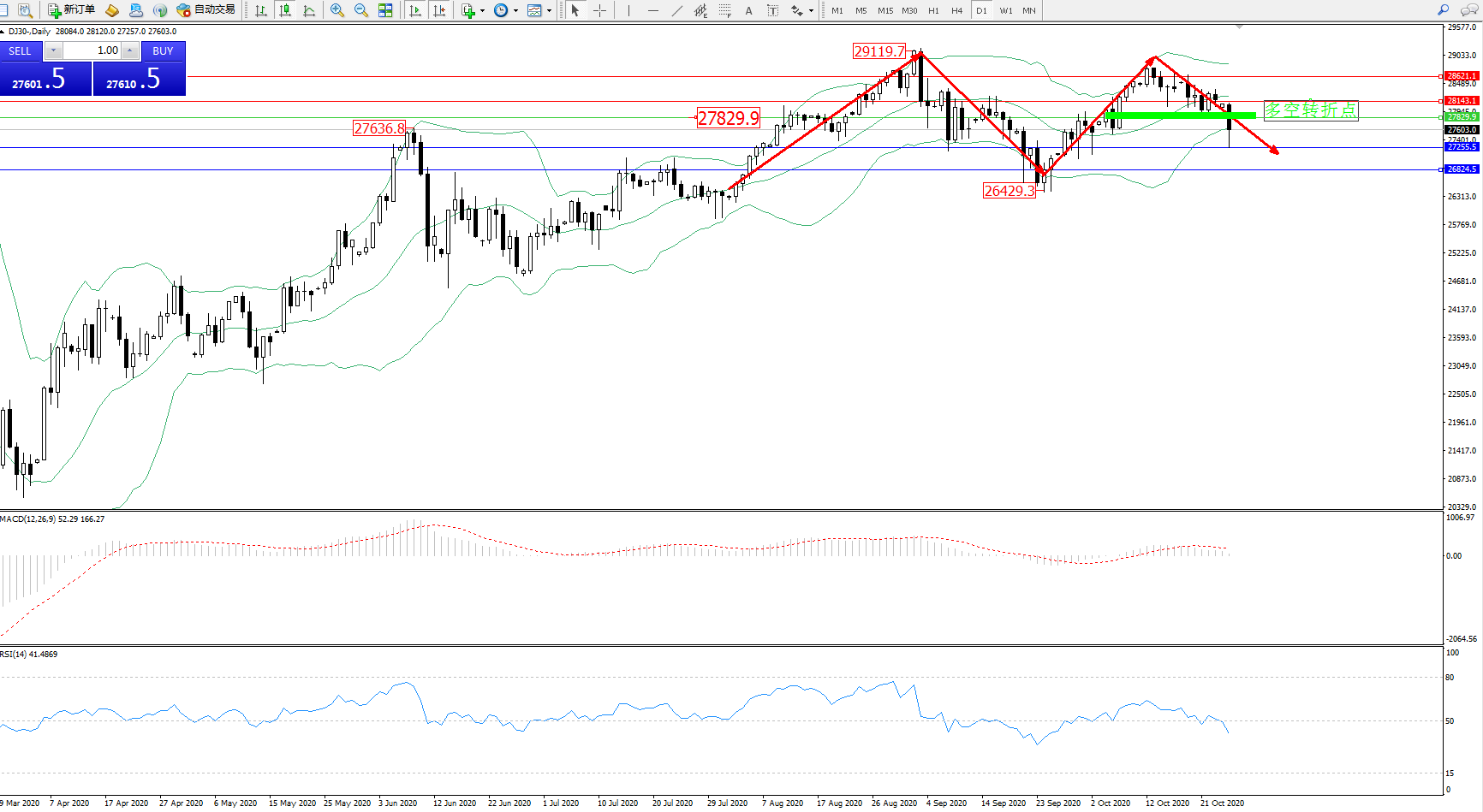 道琼斯指数10月26日(周一)收盘下跌649.90点,跌幅2.29%,报27685.64点。美股三大指数大幅收跌,因市场担心新冠疫情反弹将削弱全球经济,大选前国会批准新刺激法案的希望渺茫也令股市承压。能源和工业板块领跌,但下午股市收复了部分失地,因几只大型科技股反弹,且美国众议院议长佩洛西对达成刺激方案表示乐观。尽管时间所剩无几,投资者仍然在密切关注大选前通过刺激法案的可能性。投资者担忧美国新冠疫情以及刺激谈判前景不确定性而寻求避险。股票、大宗商品和国债收益率均下降。随着标普500指数下跌,市场变得紧张起来。危险显然在于,如果病例数继续像之前那样上升,北美不得不开始实施进一步限制措施,甚至宵禁,甚至封锁,尽管政府一再不想这样做。