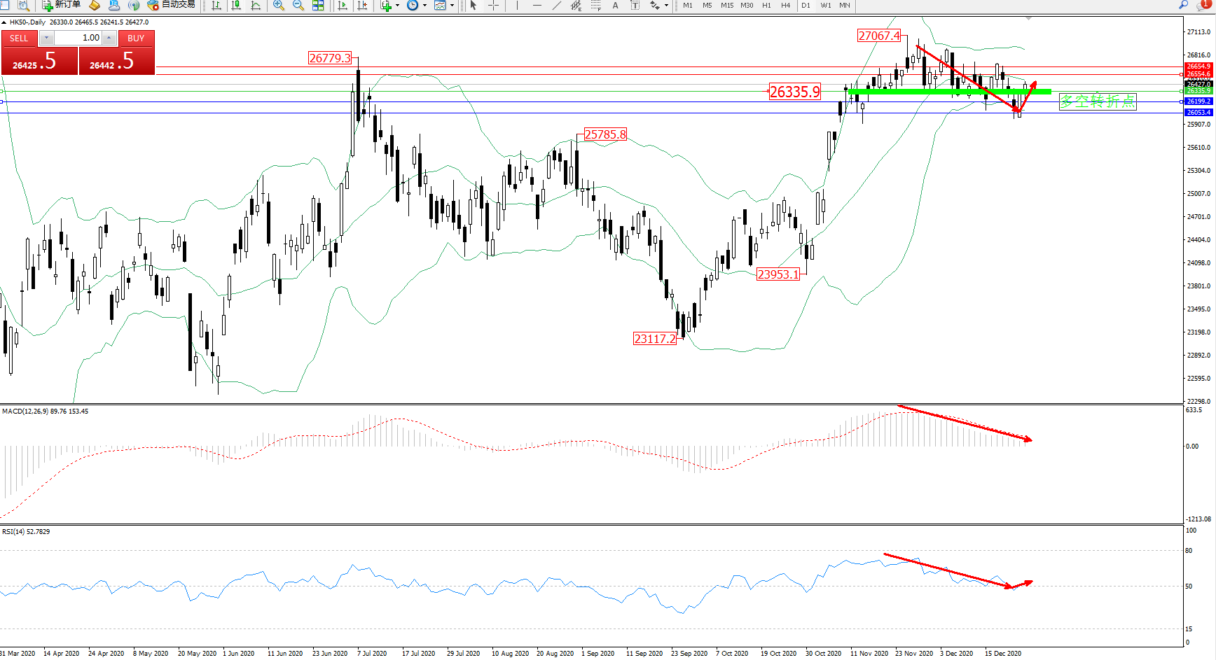 香港恒生指数12月24日(周四)收盘上涨43.46点,涨幅0.16%,报26386.56点;因圣诞假期来临,港股下午及周五休市。港股上午盘分化严重,恒生科技指数大跌3.36%报8142点。涉嫌垄断被立案调查,阿里巴巴涉嫌垄断行为被立案调查,市值跌破5万亿港元,阿里概念股亦全线下挫,并且带动科技股集体走低,京东、美团、腾讯皆跌超2%;前期活跃的汽车股跌幅靠前。南下资金半日净流入28.17亿港元,大市半日成交945.43亿港元。据香港无线新闻,香港特区政府卫生署卫生防护中心12月24日下午表示,香港新增71例新冠肺炎确诊病例,61例本地个案,31例源头不明。近日英国宣布发现了变异的新冠病毒毒株,并已将有关的信息通报了世界卫生组织,多国也宣布对英国采取关闭边境、停飞往返航班、禁止英航班入境等措施。考虑到变异病毒的特殊性及可能产生的影响,为保障中外人员健康往来,经过充分评估,中方参考多国做法,暂停中英间的往返航班。中方将密切跟踪有关的情况,并视情动态调整相关管控措施。