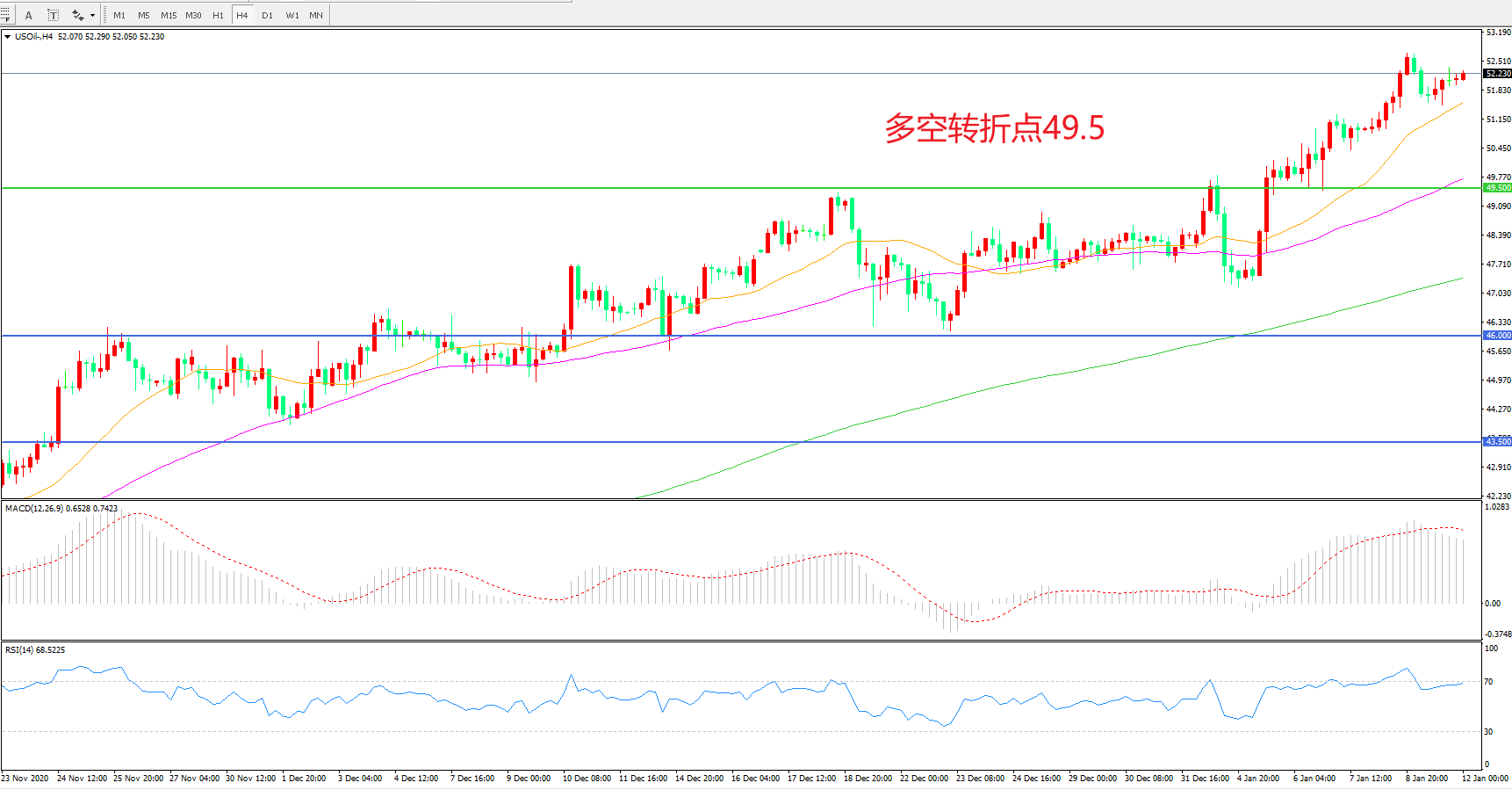 周一(1月11日),美国当选总统拜登表示,11日与众议院和参议院成员进行了会谈,首要考虑是刺激计划,市场风险情绪受到提振,美国WTI原油延续强势表现,收报52.26美元/桶。此前由于欧洲大部分地区的抗疫限制措施升至最严格,令市场重新担心主要市场用油需求回落,但火热的市场情绪忽视了这一事实。