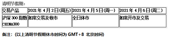 因应4月2日(周五)欧美市场耶稣受难复活节假期及4月4日(周日)中国市场清明节假期,以下产品的交易将于假期期间休市,敬请知悉留意!