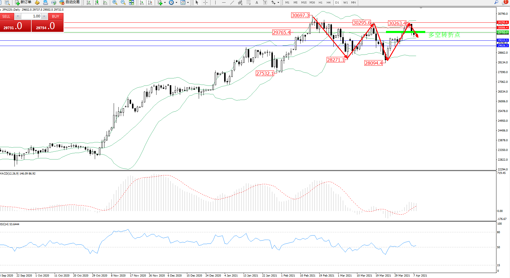技术点评:长时间维持在布林带指标通道内宽幅震荡持续中,期间多次来回试探上下轨区间节点,多头动力上行至30263位置后遇阻回撤,即将触及布林带指标中轨附近节点,短期或有进一步向下移动迹象,MACD指标处于0轴线上方多头区域维持震荡后有回撤迹象,RSI指标处于50均衡线上方多头区域维持震荡后反转急速下行中;