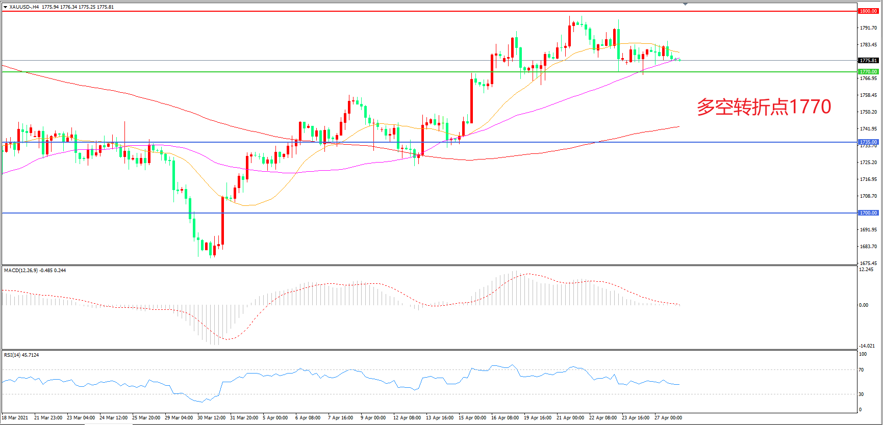周二(4月27日),美元指数走出3月初以来低谷,美国10年期基准国债收益率一度降至1.60%下方,随后一路突破1.62%,刷新一周来高位,现货黄金表现坚韧,小幅调整后收报1775.64美元/盎司。新冠病例激增可能导致印度经济停滞不前,有越来越多国家限制来自印度的旅客,以防更致命的病毒变种进入,从而可能拖累全球经济,并鼓励投资者拥抱黄金等避险资产。