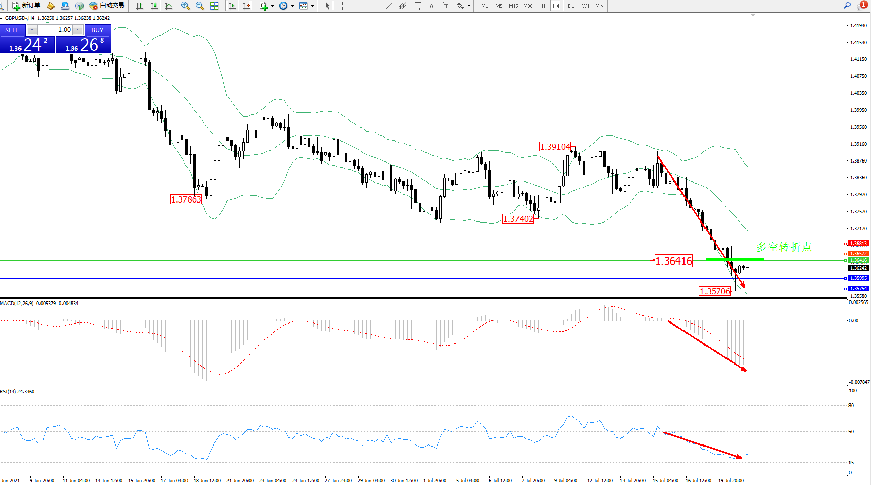 交易策略:1.36416下方看跌,目标1.35995、1.35754