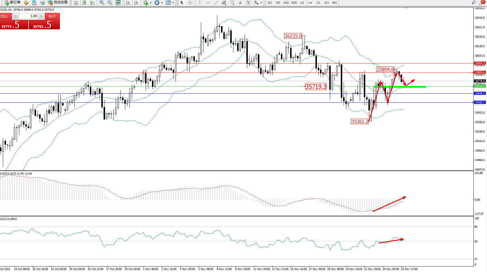 道琼斯指数DJ30——4小时K线图显示: