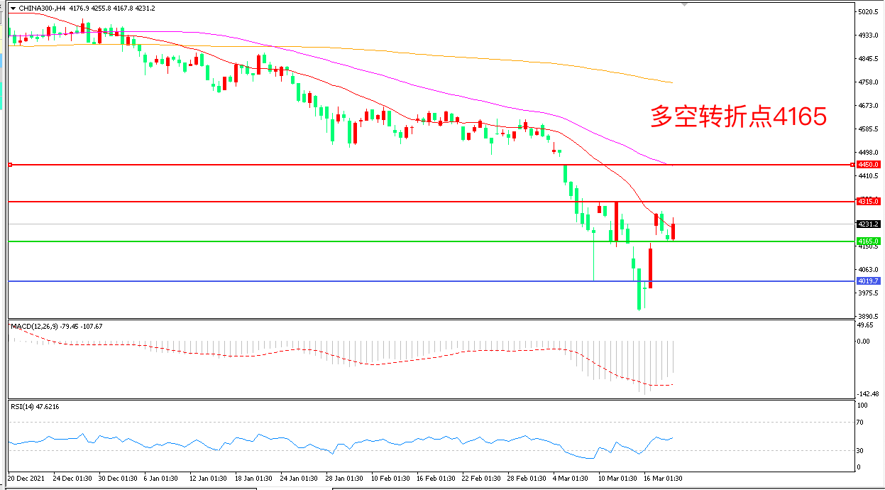 4小时图看,沪深300以4165为依托再度上行,短期走势偏强, MACD绿柱缩短,RSI指标走平,日内震荡上行概率较大。