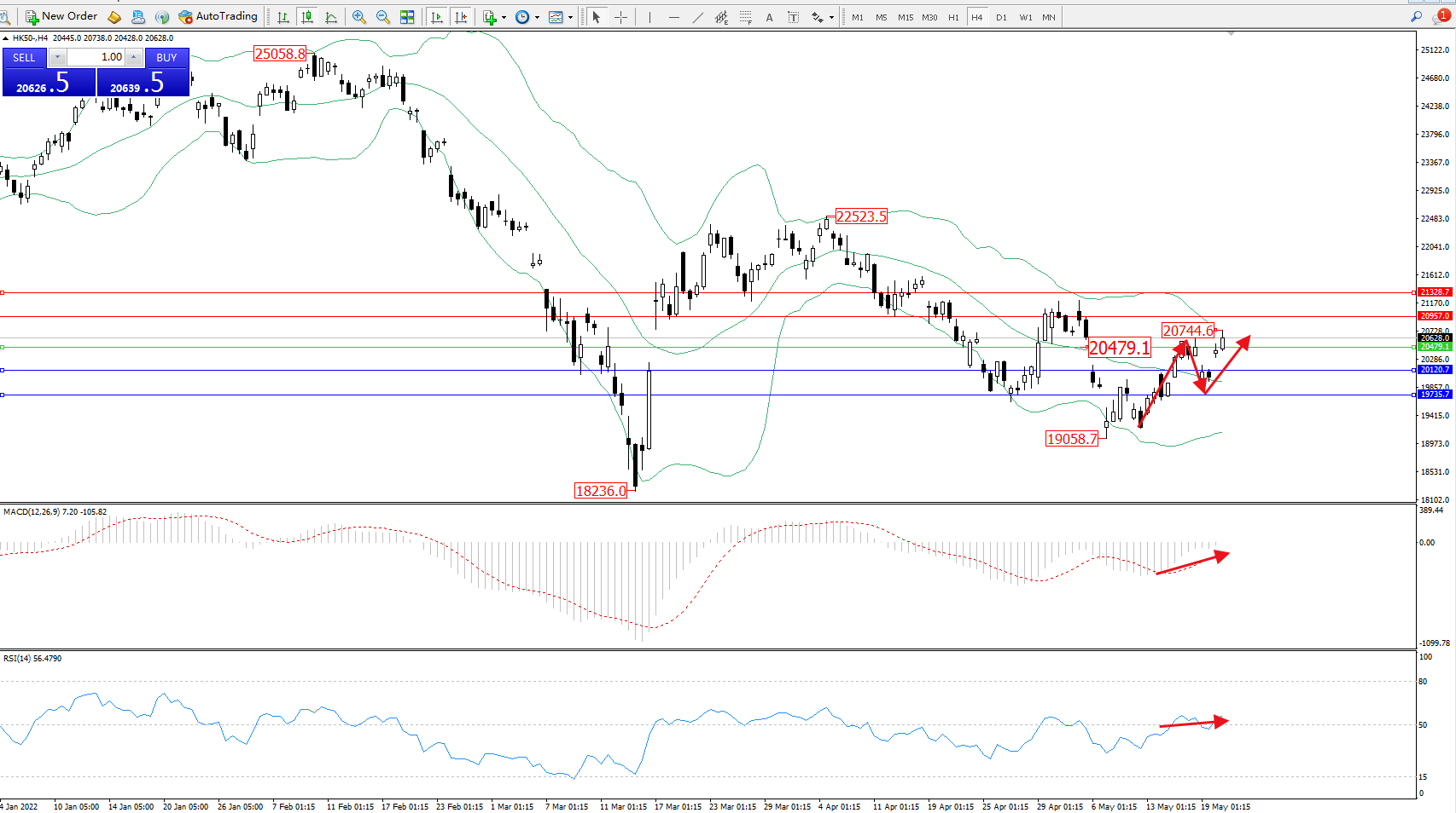 香港恒生指数5月20日(周五)收盘上涨596.56点,涨幅2.96%,报20717.24点;港股高开高走,尾盘涨幅进一步扩大,市场情绪回稳明显。恒生科技指数涨4.74%重回4200点上方。本周三大指数止跌反弹,恒指涨超4%,恒科指涨超6%。受昨日中概股大涨影响,科技股领衔走高助力市场全天走强,小米、京东涨近6%,阿里巴巴、百度、网易、快手涨超5%,腾讯涨3.5%。