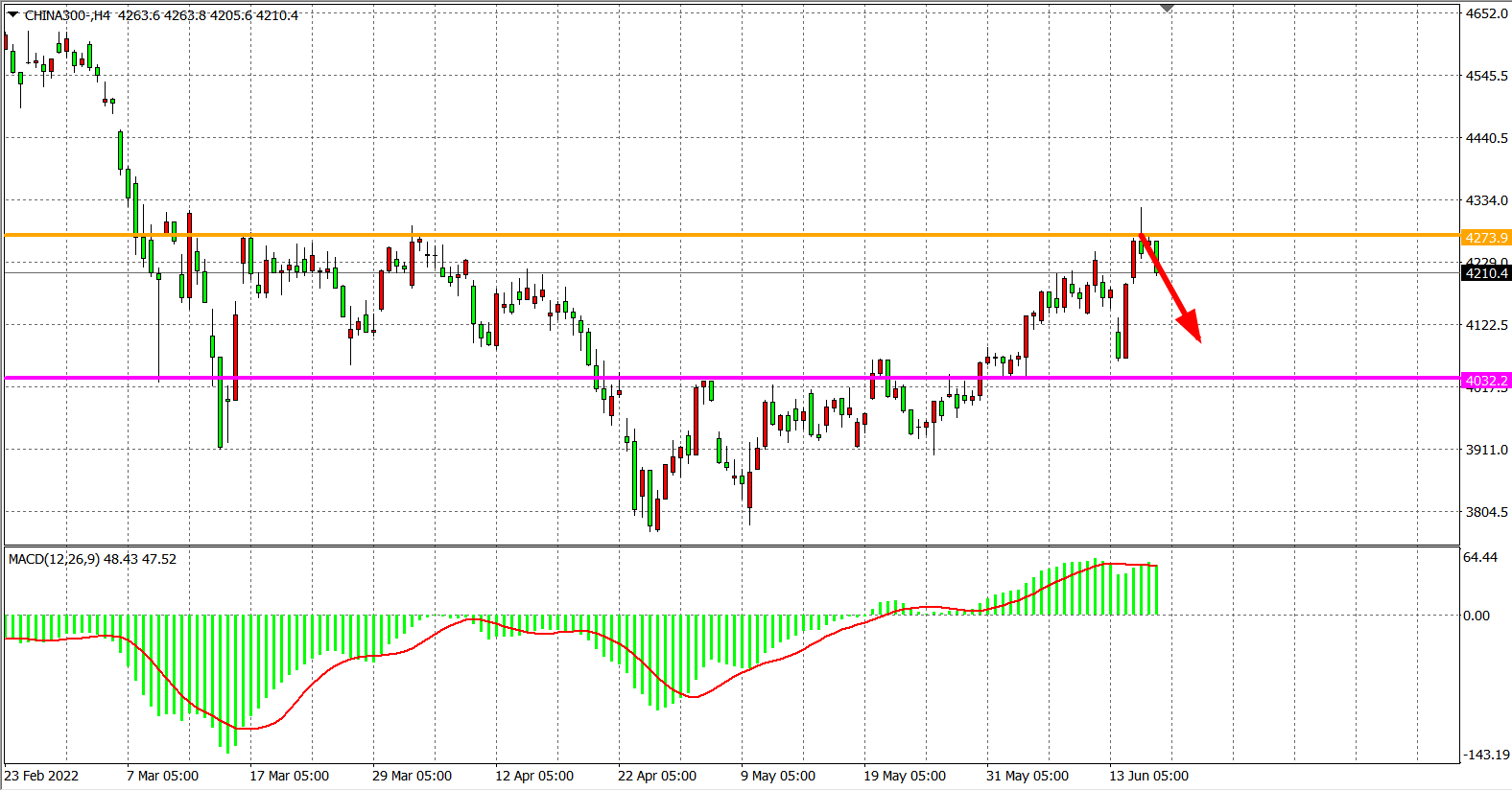 4小时图看,沪深300受4270一线压制明显,开盘上攻无果后开始回落,MACD也开始出现量能走平,预示行情短期或将延续回调震荡。日内继续以4270为多空分水岭,该位之上看涨,改位下跌看调整