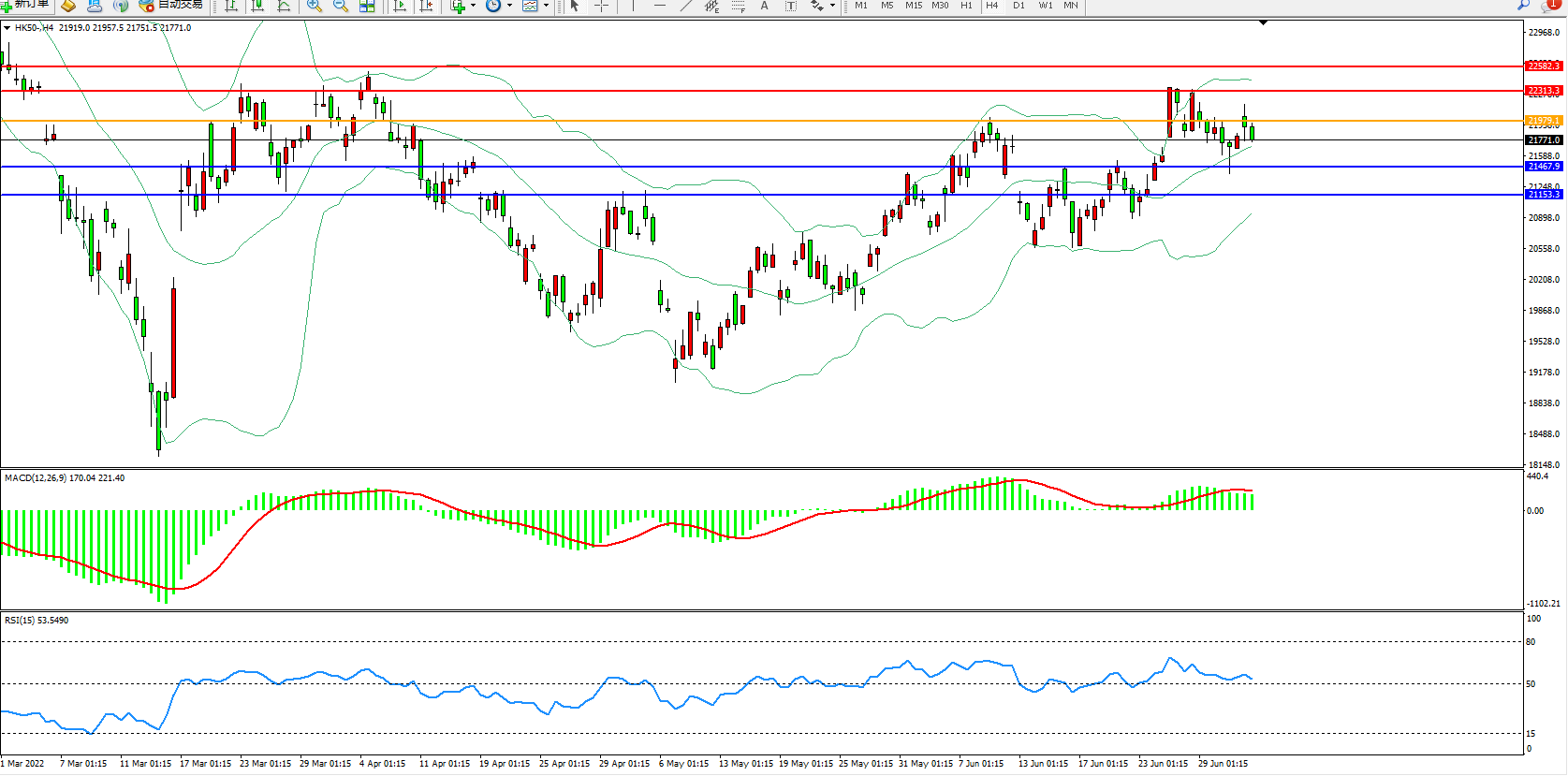香港恒生指数7月5日(周二)收盘上涨22.72点,涨幅0.1%,报21853.07点;港股高开低走,恒生科技指数盘初一度涨超2%,22000点得而复失,,大型科技股涨跌不一,阿里巴巴涨1.77%,快手涨1.33%,小米跌超3%,美团跌1.7%;生物科技股延续昨日上涨,互联网医疗股领衔走高;今日南下资金净流出0.47亿港元,大市成交额为1226亿港元。