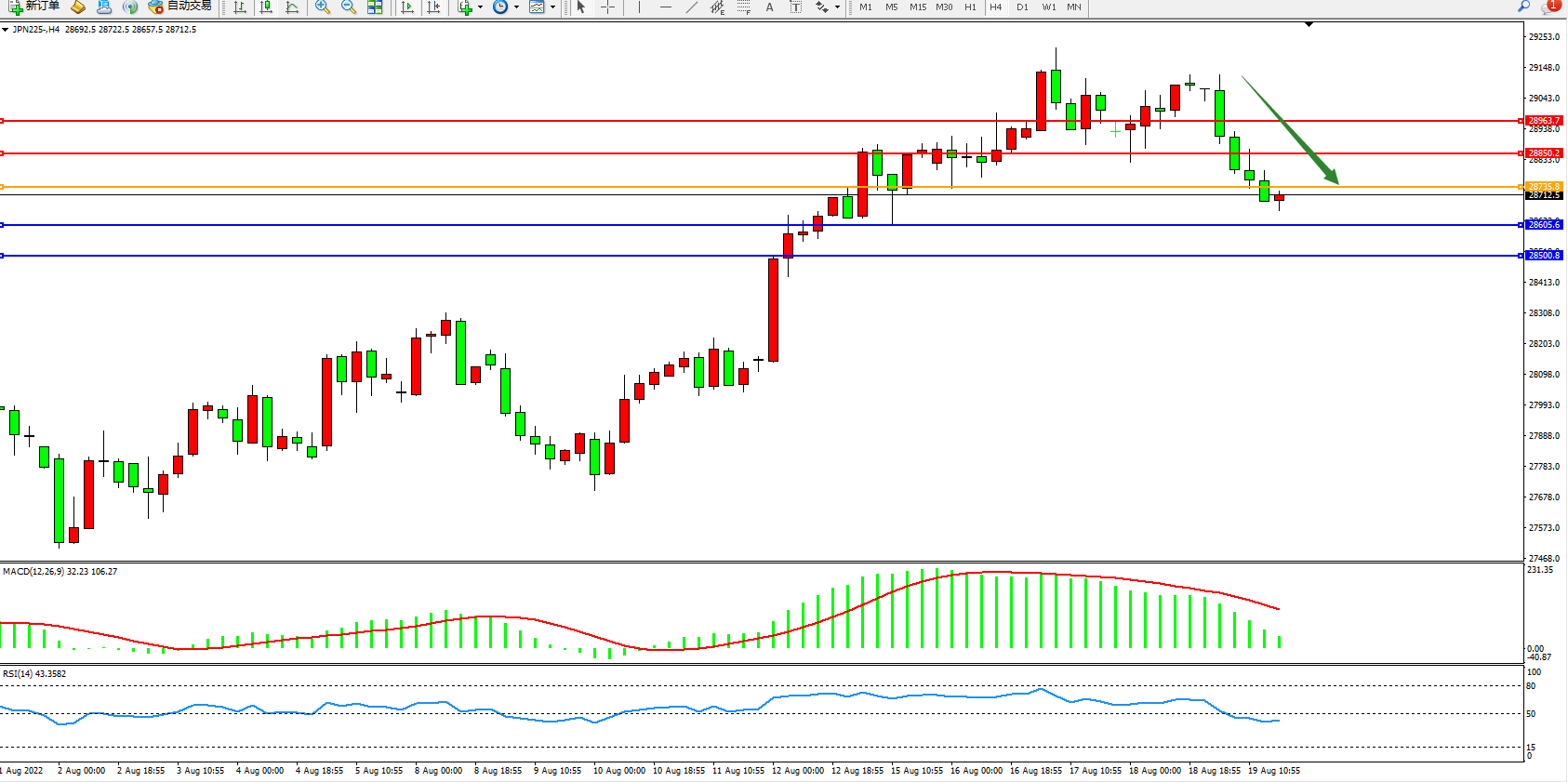 日经指数JPN225——4小时K线图显示: