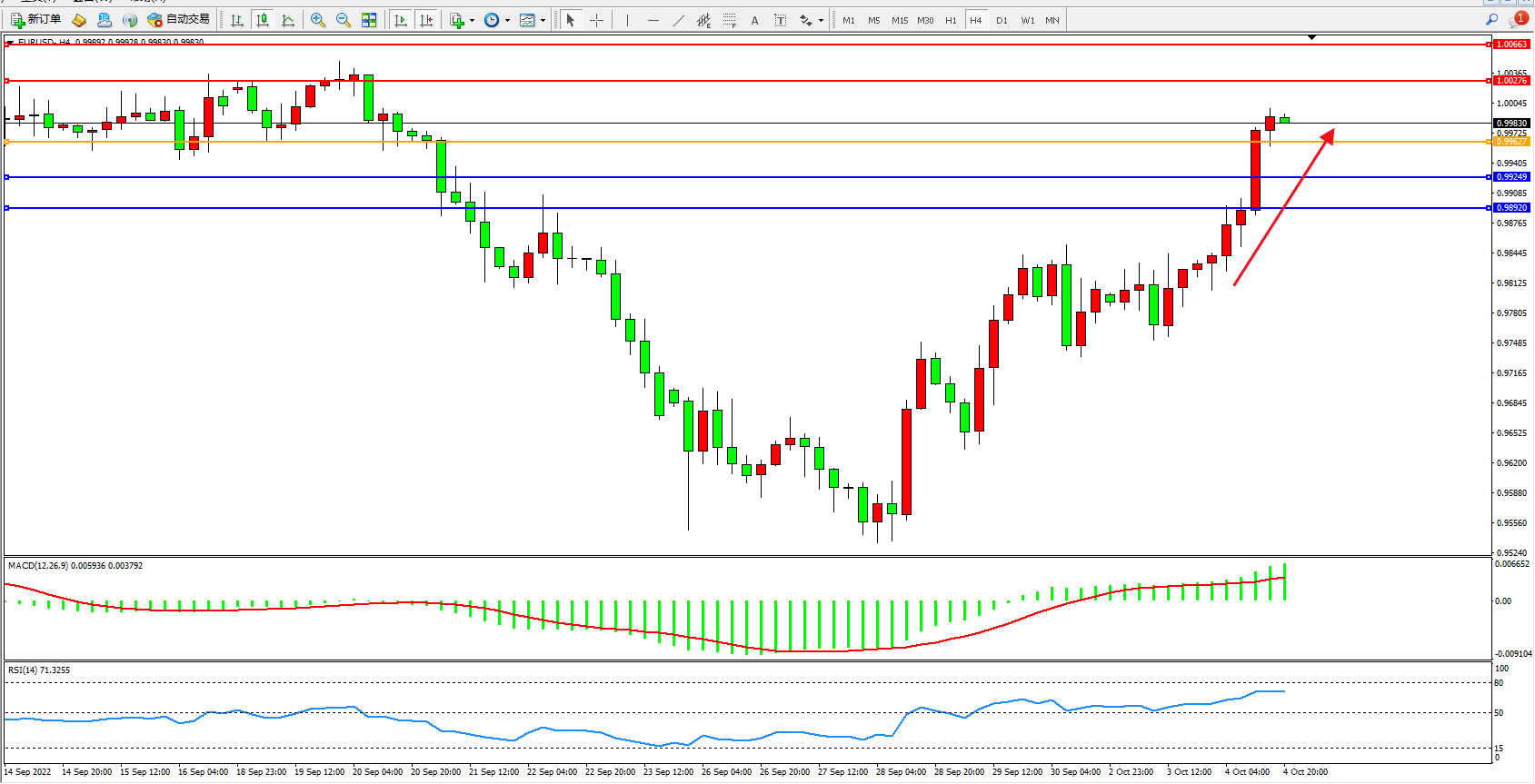 欧元美元EURUSD—4小时K线图显示: