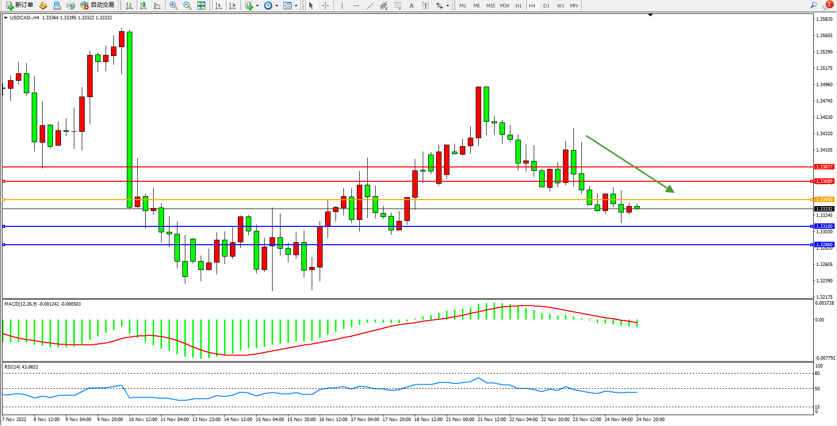 4小时图看:空头动力持续震荡下行,短期跌势或将延续,市场整体处于弱势下移中,MACD指标处于0轴线下侧弱势徘徊,RSI指标处于50均衡线下侧弱势整理;