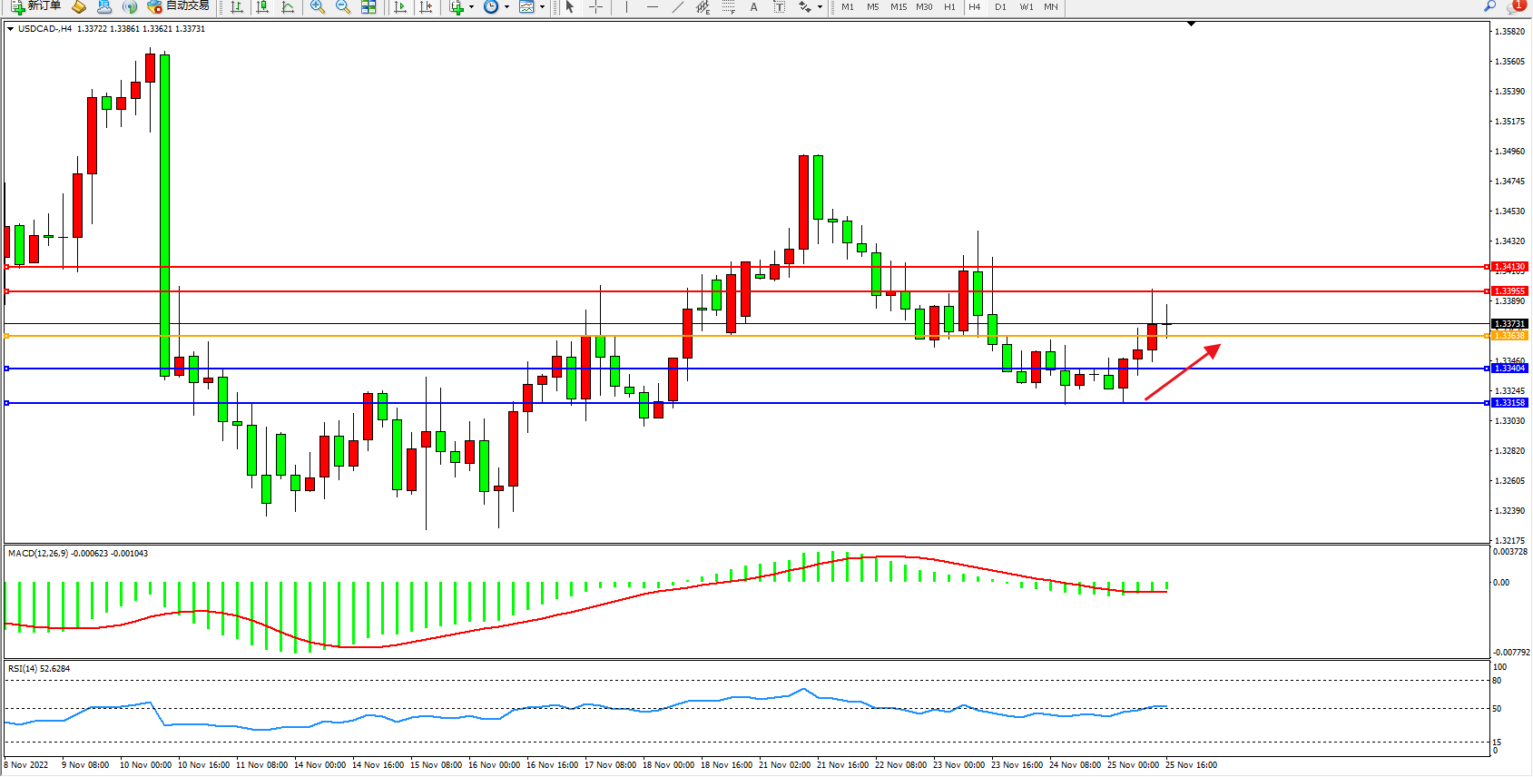 4小时图看:空头动力持续震荡下行后,短期整理,多头伺机入场上移,短期多头有持续向上移动迹象,MACD指标处于0轴线下侧徘徊,RSI指标处于50均衡线上側弱势整理;