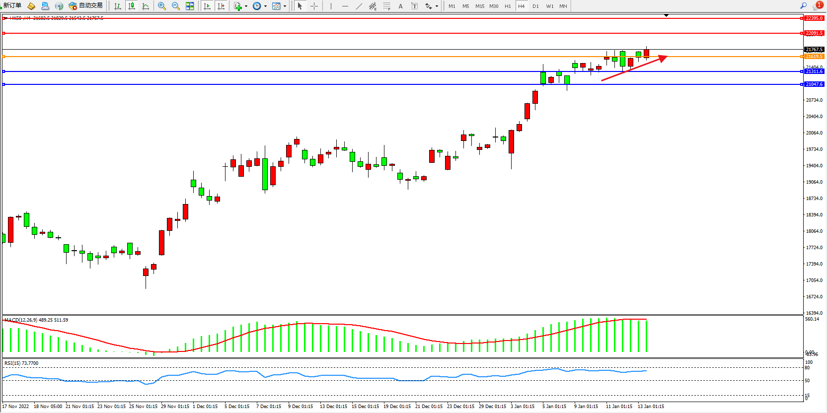 香港恒生指数1月13日(周五)收盘上涨224.56点,涨幅1.04%,报21738.66点;港股三大指数午后持续拉升上扬,恒指收涨1.04%逼近22000点,再度刷新阶段新高,国指、恒生科技指数分别涨1.09%和1.51%。早盘走势分化的大型科技股全线拉升,网易涨近5%,腾讯涨2%,阿里巴巴、小米、快手均涨超1%,南下资金微幅净流入40.48亿港元,大市成交额为1330亿港元。