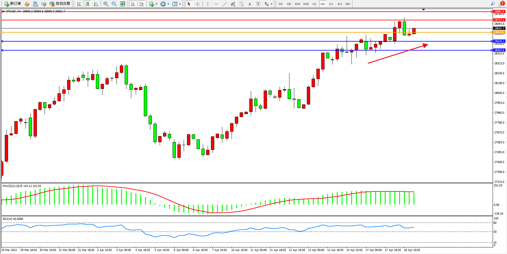 4小时图看:高位短期整理上扬,市场看涨情绪依旧,短期有继续向上移动态势,MACD指标处于多头区域高位整理,RSI指标处于多头区域维持徘徊;