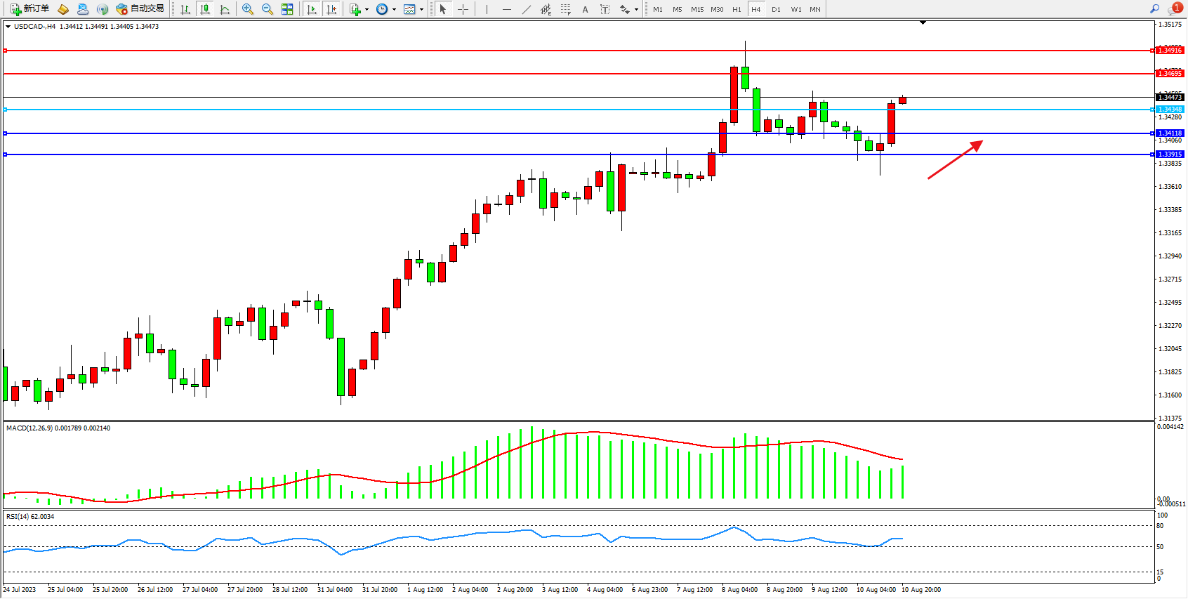 4小时图看:多头动力震荡上移,短期看涨情绪涌现,市场多头有继续向上移动迹象,MACD指标处于多头区域维持震荡,RSI指标处于多头区域缓慢上行;