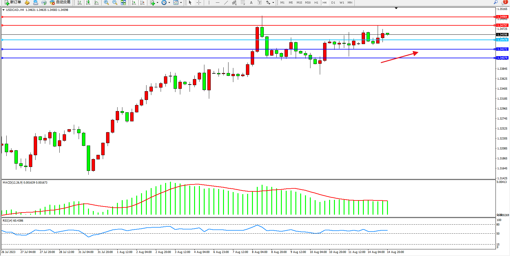 4小时图看:多头动力高位整理,短期多头动力持续向上徘徊中,MACD指标处于多头区域维持整理,RSI指标处于50均衡线上側弱势徘徊;