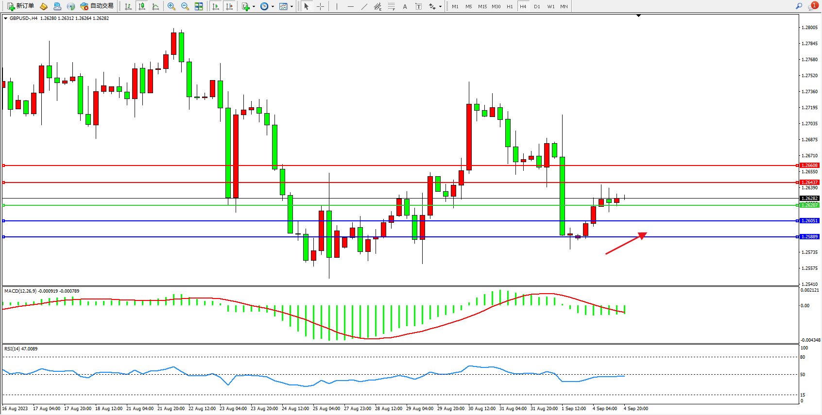 4小时图看:低位多头动力维持震荡上行,短期看涨情绪涌现,市场多头情绪持续,MACD指标处于0轴线下侧弱势整理,RSI指标处于50均衡线附近弱势徘徊;